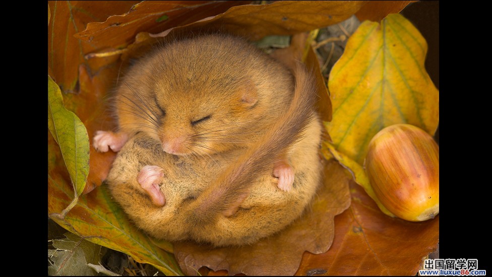 摄影师格林在这幅于德文郡拍摄的作品里,更彰显对濒危动物的关爱。在这幅秋意正浓的作品里,榛睡鼠冬眠正酣。