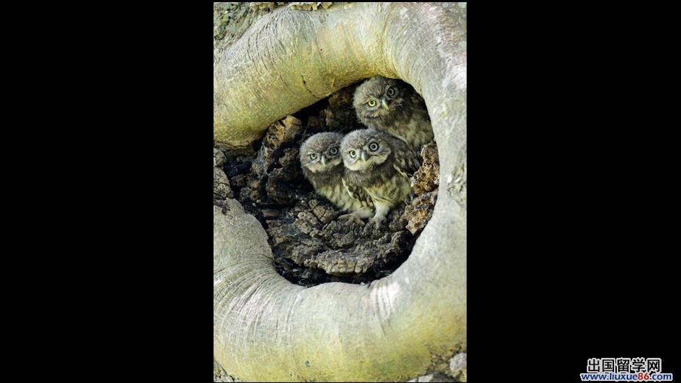 摄影师彼得斯把这三只小猫头鹰叫做三个小傀儡。他说,他在英格兰萨塞克斯拍这幅照片时需要极大耐心。他说:怎么会那么容易这三只小家伙都朝着你这一个方向看呢?