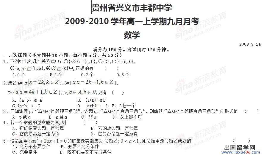 本文来源:/a/488921.html看过《贵州省兴义市丰都中学2009-2010学年高一上学期九月月考数学试题及参考答案》的人还看了以下文章