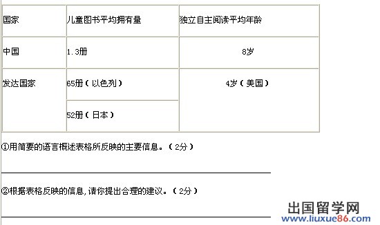 (2分)①与发达国家相比,我国儿童的图书平均拥有量太少,养成独立自主阅读习惯太晚。