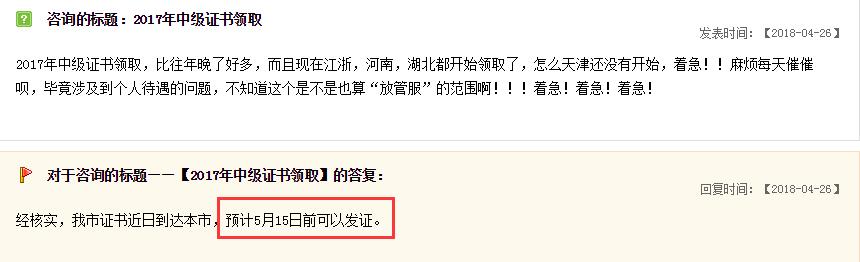 小编从天津会计网的回复中得知“预计5月15日前可以领证”。