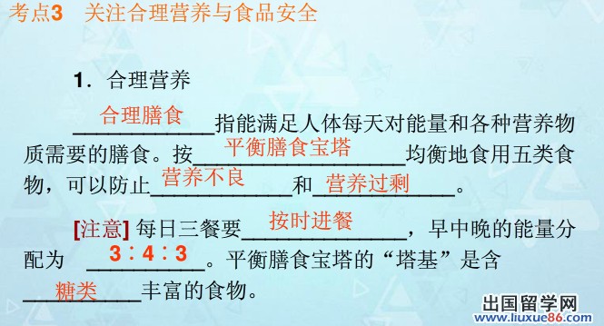 同学们复习《关注合理营养与食品安全》时要注意重难点:重点:①关注合理营养和食品安全在健康生活中的意义;②学生通过分析,认同环境保护与食品安全之间的统一性。难点:设计一份营养合理的食谱,将所学知识上升为意识,再由意识转化为行为。更多有关2014中考生物的信息可登录开云官方网页版生物频道,欢迎收藏本站(CTRL+D即可收藏)!