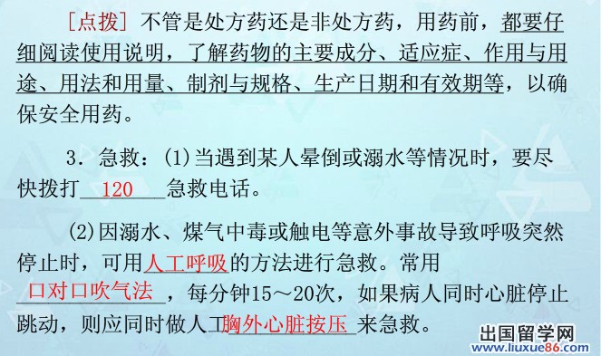 同学们复习《用药和急救》时要注意重难点:学习重点:理解安全用药的概念;分析药品标签中包含的重要信息。学习难点:会说出一些常用药物的名称、作用和使用方法。更多有关2014中考生物的信息可登录开云官方网页版生物频道,欢迎收藏本站(CTRL+D即可收藏)!