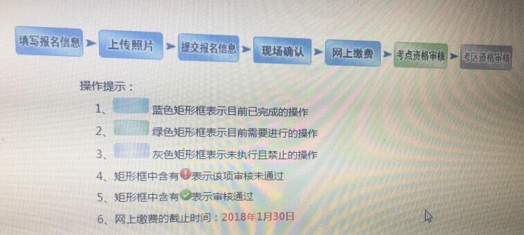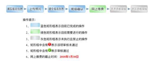 通过之前艰难的报名信息填报和现场确认之后,网上缴费这样一步也是很重要的,跟上面一样,未在规定时间内缴费的,一律视为网上报名无效,网上缴费时间截止2018年1月30日。