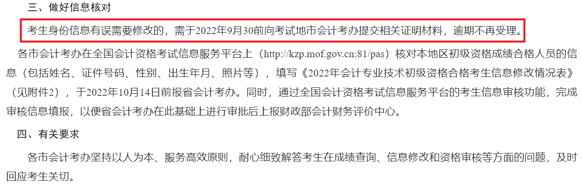 考生身份信息有误需要修改的,需于2022年9月30前向考试地市会计考办提交相关证明材料,逾期不再受理。