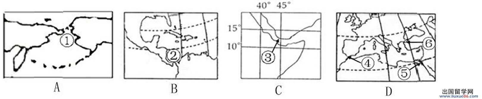 下图中A图中①是白令海峡;B图中②是巴拿马运河;C图中③是曼德海峡;D图中④是直布罗陀海峡,⑤是苏伊士运河,⑥是土耳其海峡。