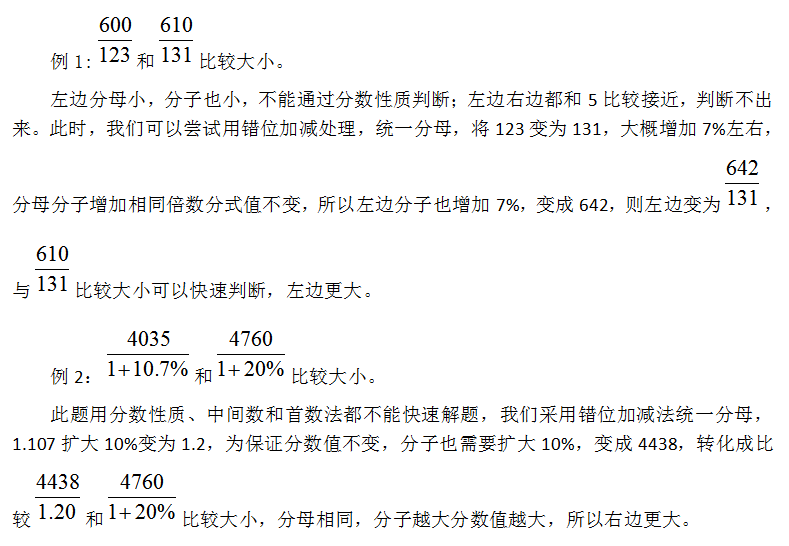 行测考试中一定会有资料分析这类题目,其中部分题目需要我们比较两个数的大小关系,或者从若干数字中选出最大值最小值。数据相差较大时很容易比较大小,通过分数性质、找中间值或者首数法可以判断出来,但如果两数间差距小,判断大小就会有一定难度,我们可以利用错位加减法统一分母或者分子,再利用分数性质判断大小,今天就来具体讲一讲错位加减法的运用。