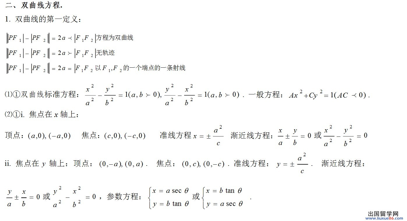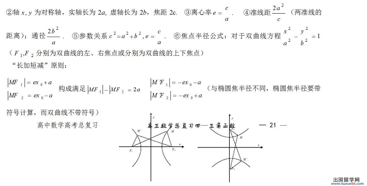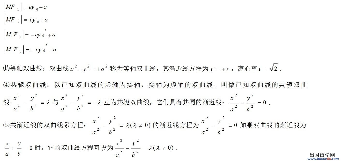 (7)共轭双曲线:方程 x^2/a^2-y^2/b^2=1与x^2/a^2-y^2/b^2=-1 表示的双曲线共轭,有共同的渐近线和相等的焦距,但需注重方程的表达形式.