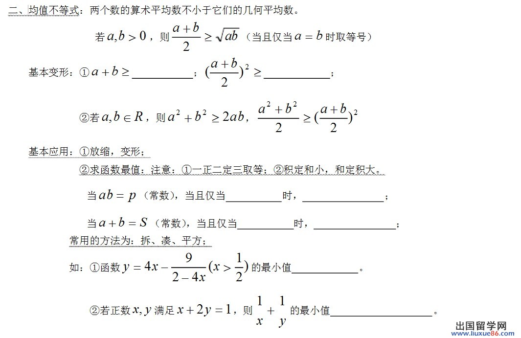 1、基本不等式。和定积最大:当a+b=S时,ab≤S^2/4(a=b取等),积定和最小:当ab=P时,a+b≥2√P(a=b取等)。