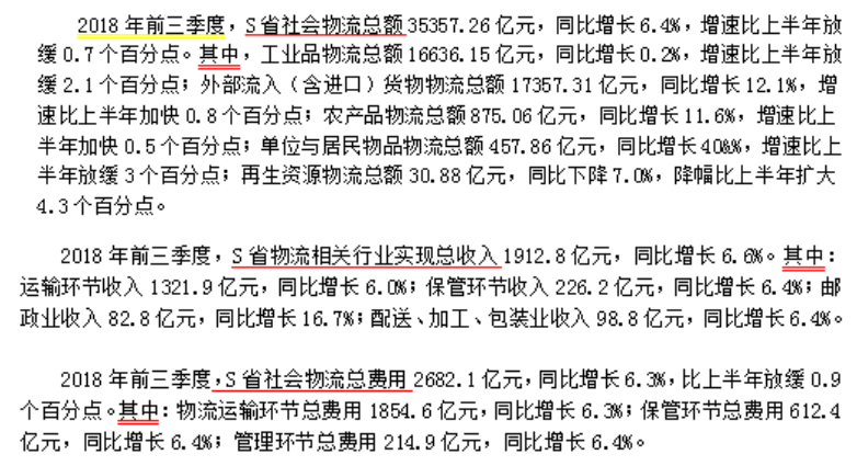 通过读第一段第一句能知道,第一段讲的就是关于“S省社会物流总额”的情况,“其中...”,表明对“物流总额”做了分类,所以应该知道第一句所讲的统计指标与其中之后的统计指标为整体与部分的关系,进而联想到可能会对比重相关知识点作以考查。