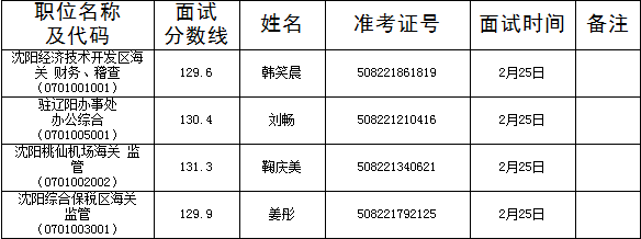 请以上4名考生于2月18日前发送邮件确认是否参加面试,并按照《沈阳海关关于2016年度公务员考录面试开云官方网页版围人员寄送材料的通知》、《沈阳海关2016年考试录用公务员面试公告》要求,准备相关材料,按时参加资格复审和面试。