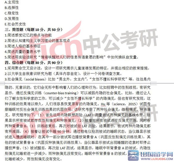 对于今年苏大的论述题,整体感觉是,它太重视心理学理论知识的应用了。除了第1小题,后面3小题,题目都是:结合实例,论述……唯一一个不用结合实例的第1小题,也还...