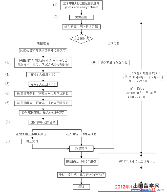 全国报名时间:根据2013年报名时间为10月10日—31日 每天9:00-22:00。预计2014年报名时间为10月中旬至10月底结束。随时关注出国留学考研网最新动态
