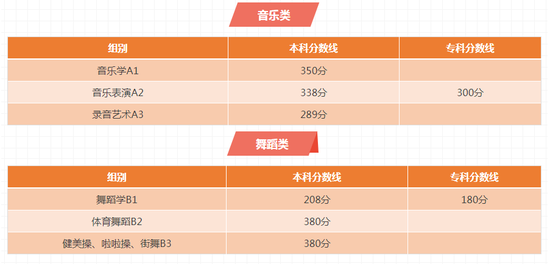 音乐学A1:本科339分、高职(专科)325分。