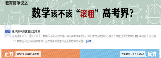 2013年11月07日 感谢您阅读由高考频道(/gaokao/)编辑、收集、整理的《"数学滚出高考"成热门话题 七成网友支持》资讯,liuxue86.com高考资讯来源于LIUXUE86.COM高考!