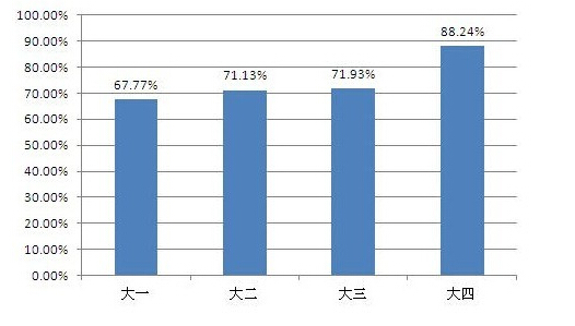 The column chart clearly reveals the statistics of students taking part-time jobs in a certain university. According to the survey, there has been a steady increase from 67.77% to 71.93% for students holding temporary jobs from freshmen to juniors, while the percentage of seniors working part-time jumped markedly to 88.24%.
