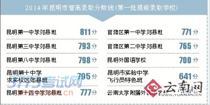 此外,2014年昆明市公办一般普通高中录取最低控制线为:主城区615分、郊县区595分、普高特色班595分,民办普通高中招收昆明考生录取最低控制线为565分,民办普通高中招收其他州(市)考生录取分数线控制在当地升学成绩总分的70%以上。