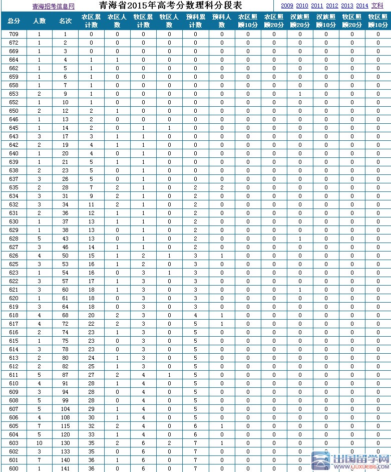 点击下面图片即可查看青海省2015高考分数理科分段表完整版
