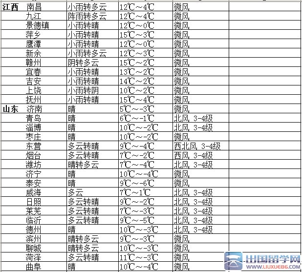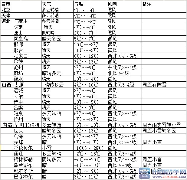 共包括四个要素,分别是天气、气温、风向和备注。前三个很好理解,都是常见天气预报名词,只不过笔者把这三天的天气状况进行了综合。其中,温度指的是这三天的最高温和最低温。天气指的是三天的总体状况,如有雨雪天气会特别指出。风向指的是三天中的最大风级。备注一栏显示的是考研之前的雨雪等不利天气。若是空格则表示天气状况良好。另外,天气多变,预报也不是100%准确,同学们要灵活应变。