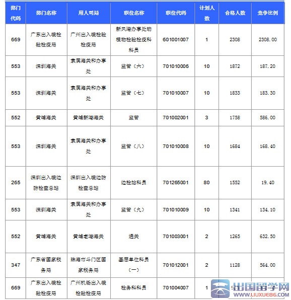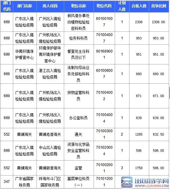 截止到24日18时,竞争最激烈的职位为新风港办事处动植物检验检疫科科员一职,该职位招录1人,通过人数为2308人,竞争比高达2308:1!