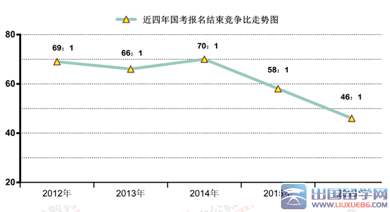 从近四年国考招录情况来看,2016国考招录达到顶峰,接近3万。而从近5年国考报名结束之日最后的过审数据来看,近两年基本持平,都接近130万,可见,今年与去年相比,国考热度依然没有减弱。从竞争比看,今年的竞争比略低,46:1。这与今年招录基数大有关。