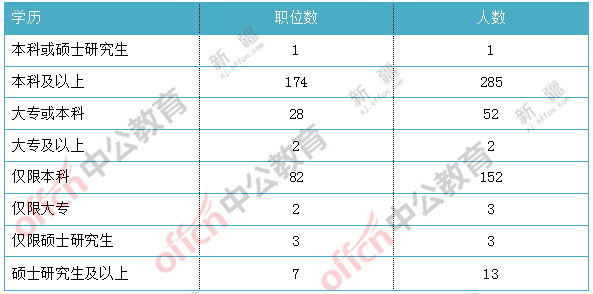 学历层次上来看,此次国考新疆职位表统计显示,招录最多的是本科学历,可报考岗位285个,招录499人,占总人数的97.6%%,,其中“仅限本科”的人数为152人;研究生可报考职位共11个,招录17人,其中“仅限硕士研究生”的人数3人。另外,值得注意的是,本次考试中大专学历可以报考的岗位仅有30个,共招录54人。总体来说,本科仍然是大多数部门最青睐的学历层次,而研究生和专科生也可以根据不同的岗位要求灵活报考。