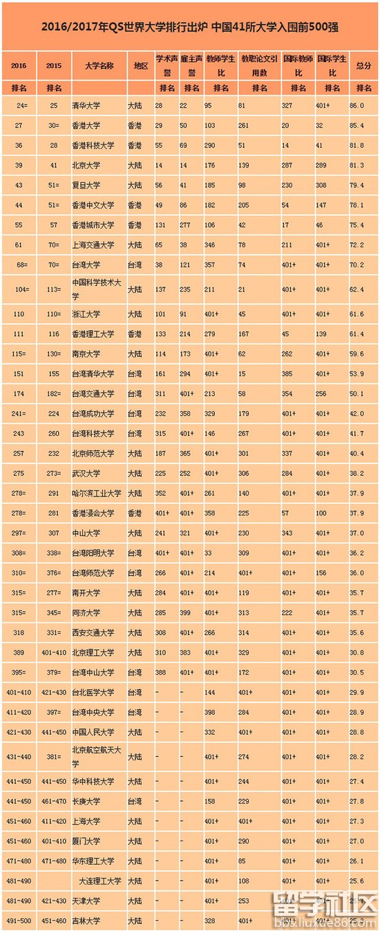 从各国开云官方网页版围的高校数量上看,中国高校在2016/2017年QS世界大学排行榜上表现不俗,共有56所高校上榜。其中中国内地33所,中国香港7所,中国澳门1所,中国台湾15所。