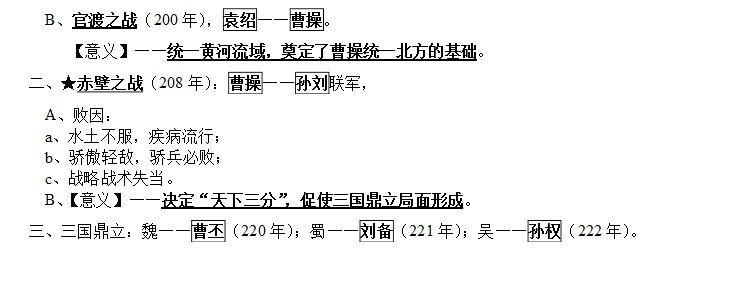 引导学生掌握官渡之战和赤壁之战的历史作用、曹操能够统一北方的原因、赤壁之战曹操失败的原因以及三国鼎立局面形成的原因。
