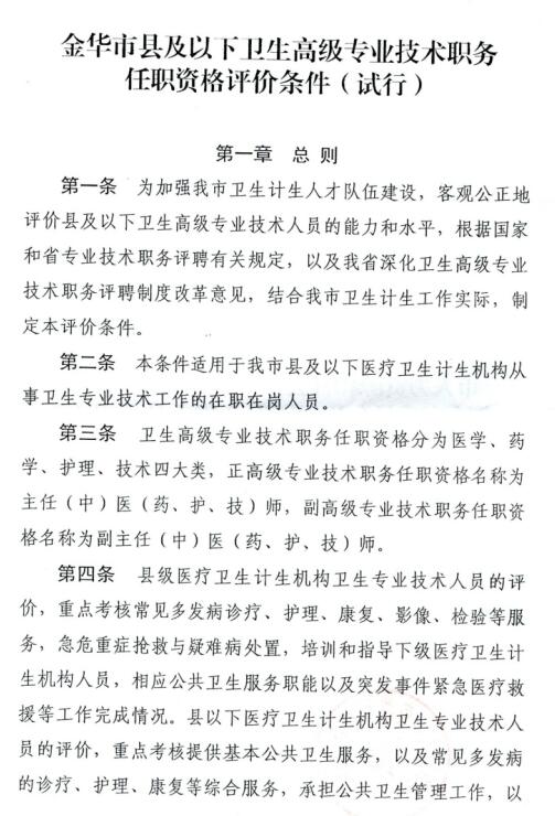 浙江金华县以下卫生高级专业技术职务任职资格评价条件(试行)通知