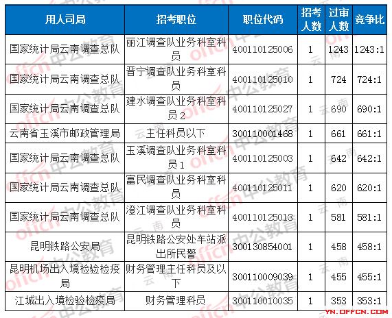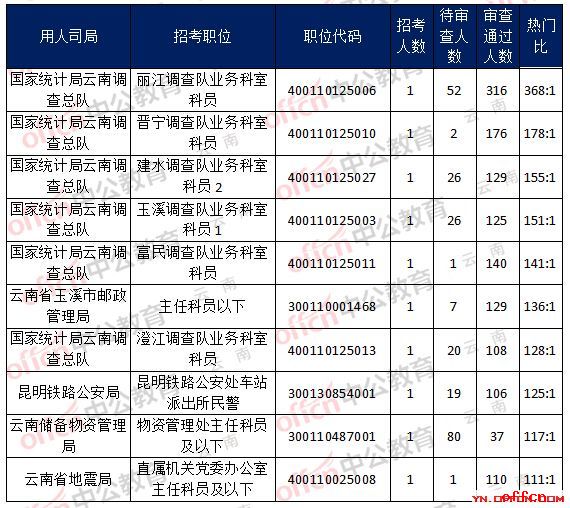当前最受欢迎的岗位是国家统计局云南调查总队,丽江调查队业务科室科员,职位代码:400110125006,招录1人,316人报名,其中52人待审核通过,详情如下图: