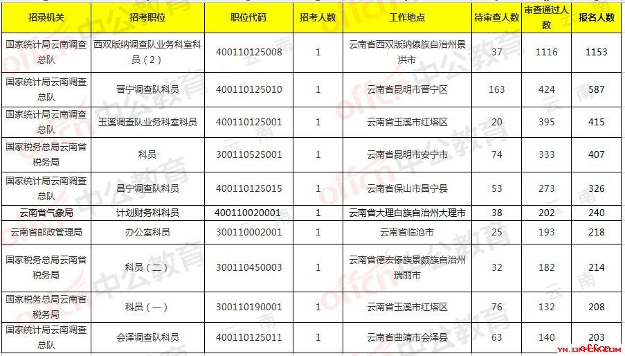 职位分析:职位分析:截至2018年10月25日9时国家公务员考试云南考区无人报名的岗位仅剩2个,在这里提醒各位考生,需要抓紧报名时间,以免错过2019国家公务员考试;