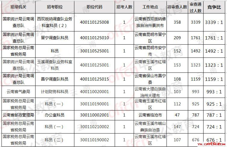 职位分析:截至2018年10月31日9时报名第10天,国家公务员考试云南考区报名人数最多的岗位是西双版纳调查队业务科室科员(2)职位代码:400110125008,该岗位招录人数1人,报名人数3697人,待审查人数为358人,审查通过人数为3339人;该职位学历仅限本科,专业要求为:理工、工学;工作地点:西双版纳傣族自治州景洪市,从报考条件来看该职位虽然要求宽泛,在这里提醒未报考的考生,一定要理性报考适合自己的职位。