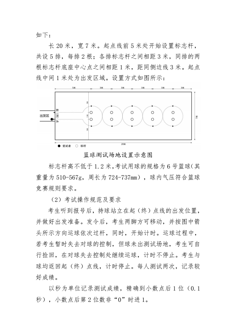 考生听到报号后,持球站立在起(终)点线的出发位置,并做好出发准备。发令后,考生两脚方可移动,并按图中箭头所示方向运球依次过杆,同时,开始计时。运球过程中,若考生暂时失去对球的控制,但球未出测试场地,考生可自行捡回,在对球失去控制处继续运球,计时不停止。考生与球均返回起(终)点线,计时停止。每人测试两次,记录较好成绩。