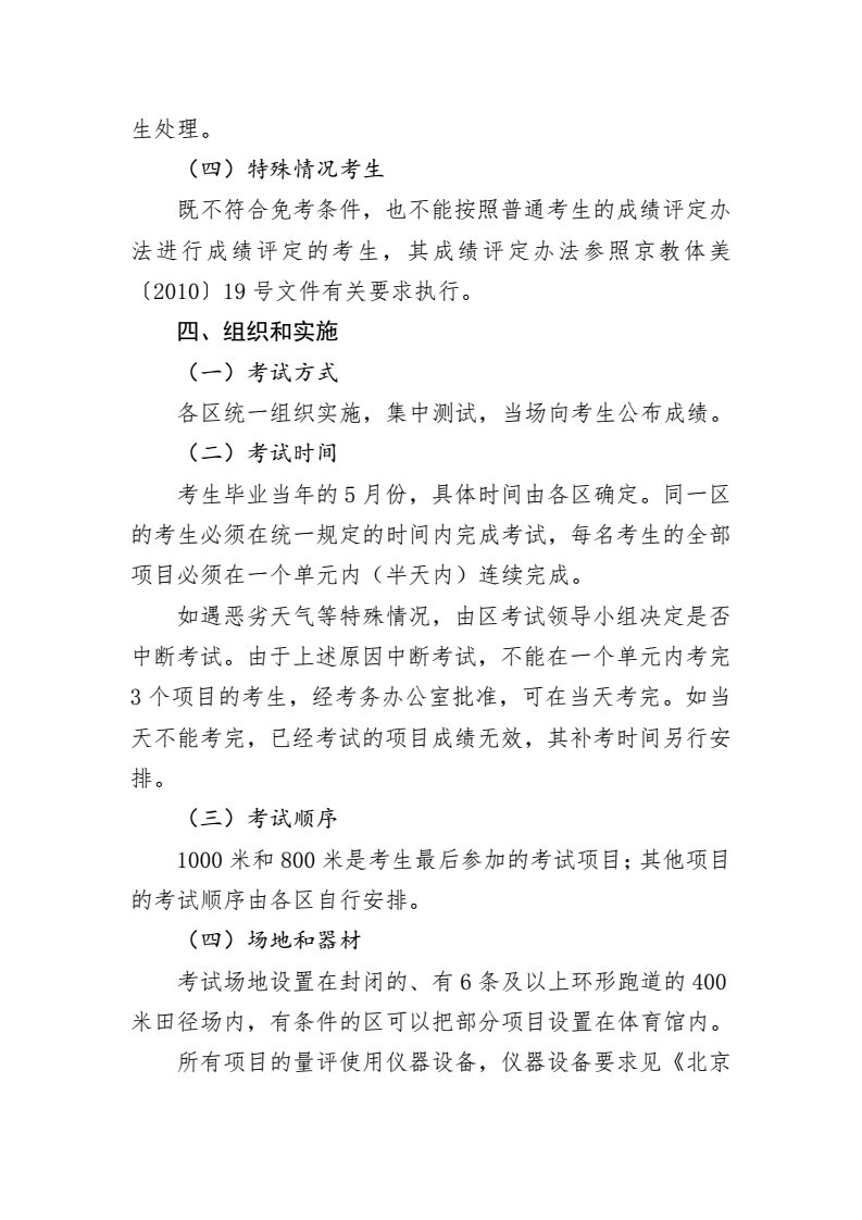 各区要统一集中测试,当场向考生公布成绩。同一区考生要在统一规定时间内完成考试。每名考生的全部项目要在一个单元(半天)内连续完成。如遇恶劣天气等特殊情况,由区考试领导小组决定是否中断考试。由于上述原因中断考试,不能在一个单元内考完3个项目的考生,经区考试领导小组批准,可在当天考完。如当天不能考完,已经考试的项目成绩无效,其补考时间另行安排。1000米跑和800米跑是考生最后参加的考试项目。其他项目的考试顺序由各区自行安排。每一个单元考试开始前,将对场地器材的准确性和安全性进行检查。