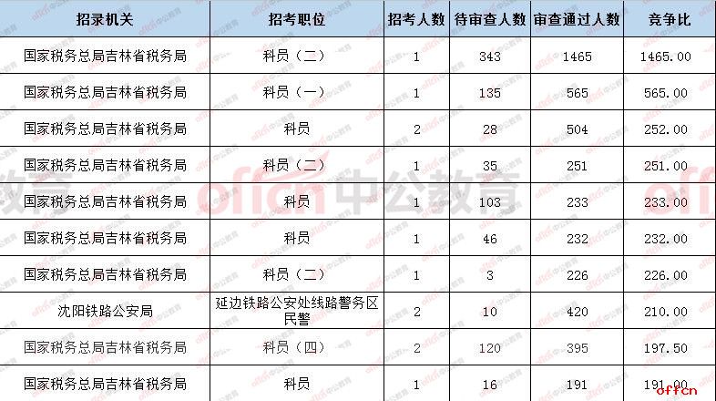 报名人数前十的职位主要集中在吉林省国家税务局、沈阳铁路公安局等部门,具体信息如下: