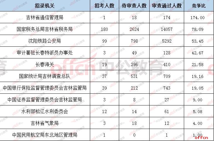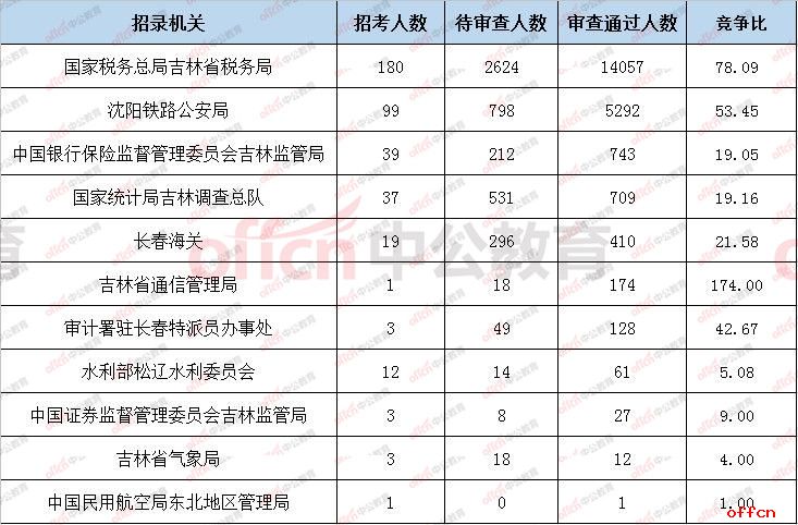 截止到25日9时,通过审核人数前三位的部门依次是:吉林省国家税务局、沈阳铁路公安局、吉林监管局,三部门通过审核总人数达4068人,占通过审核总人数的92.58%。