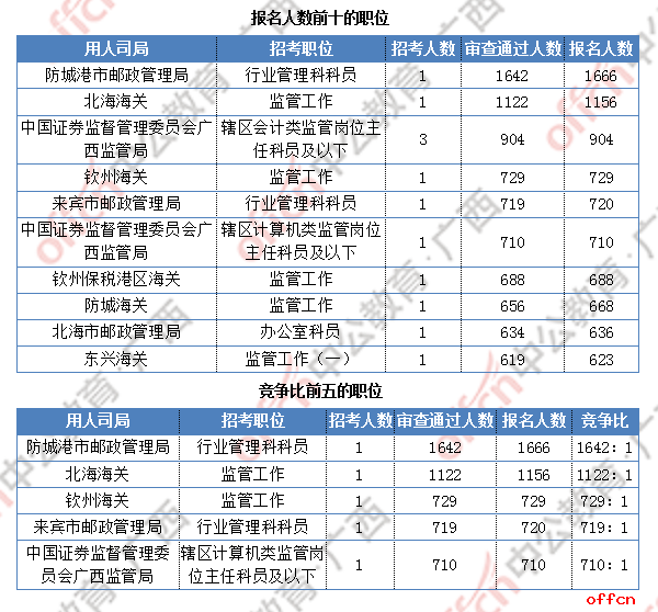 报名人数前十的职位主要集中在广西壮族自治区邮政管理局、中国证券监督管理委员会、南宁海关等部门。整理了报名人数前十的职位以及竞争比前五位的职位,供广大考生参考: