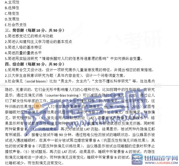模拟题对于心理学备考期间的考生来说,十分重要。通过做模拟题,考生会熟悉大量的题型,因此会避免出现考场恐慌的现象。下面是出国留学考研网辅导老师提供的心理学模拟题: