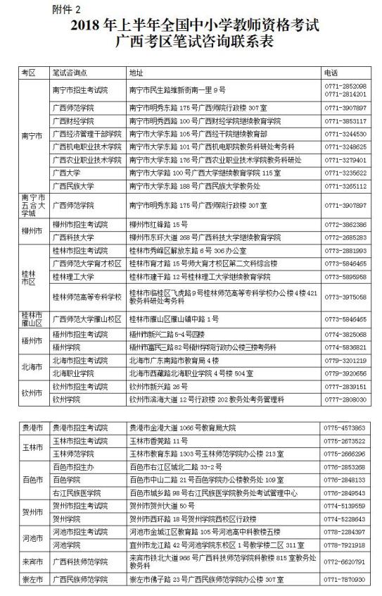 2018上半年广西教师资格证考试考区联系电话