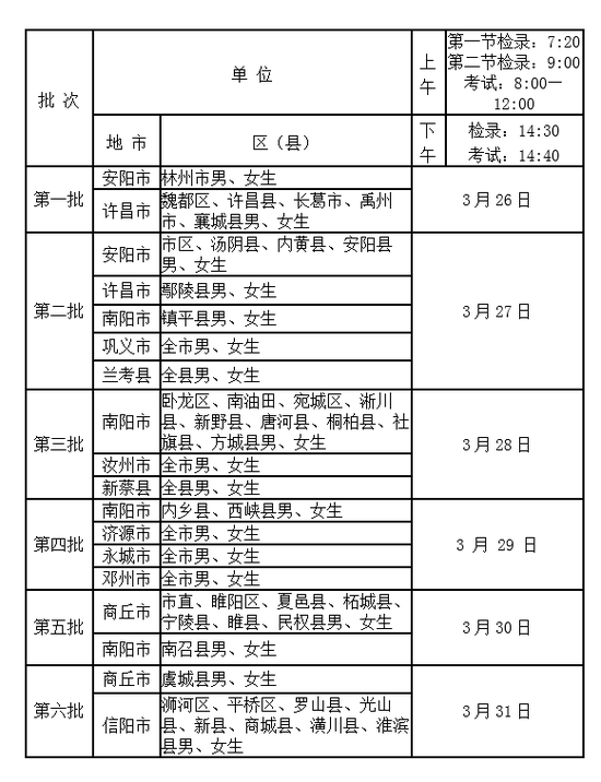 一、考试时间:考试按市(县)分批进行,具体批次和时间安排见下表。