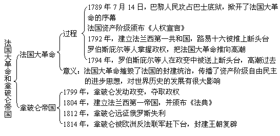 1.重点:《人权宣言》的颁布,法国大革命的历史意义和拿破仑的内外政策