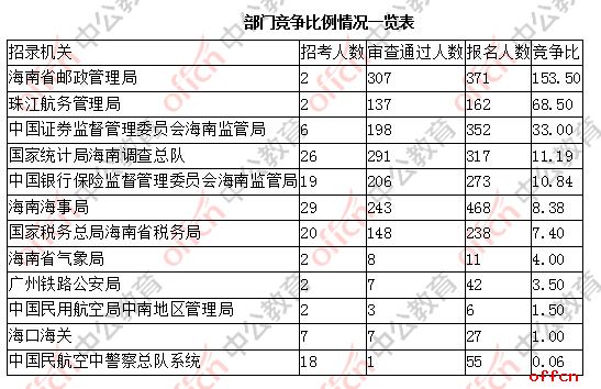 从竞争比来讲,目前竞争比最高的部门为海南省邮政管理局,达到154人竞争1个职位。