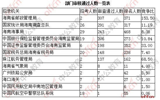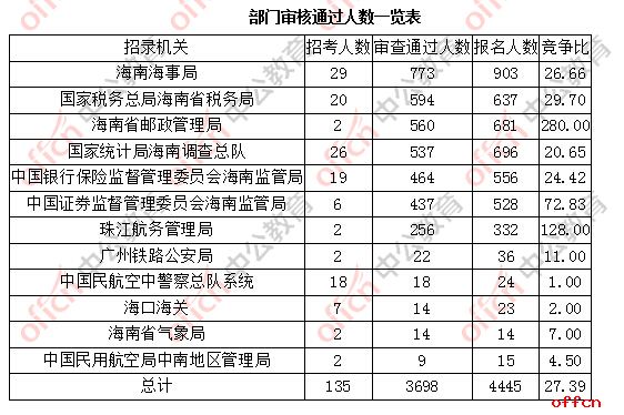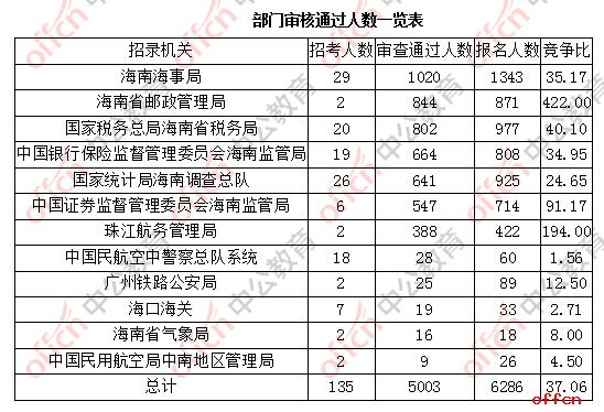 截止到25日9时,通过审核人数前三位的部门依次是:海南省邮政管理局、国家统计局海南调查总队、海南海事局,三部门通过审核总人数达841人,占通过审核总人数的54.05%。。