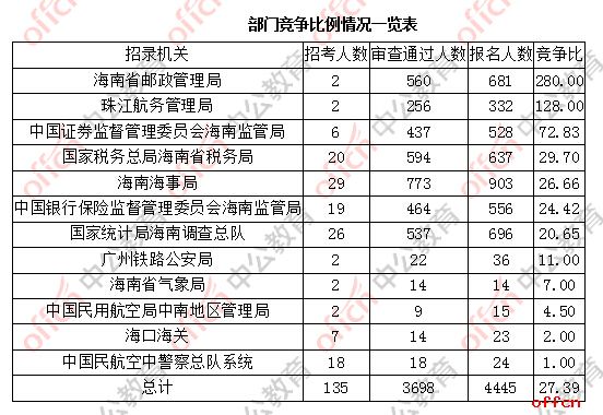 从竞争比来讲,目前竞争比最高的部门为海南省邮政管理局,达到280人竞争1个职位。