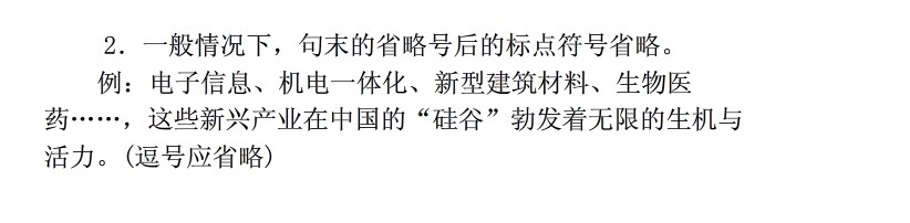 在省略号前面的如果是一个完整的句 子,则句末要加点号(或“?”或“! ”)。在 省略号后面如果还有文字,且文字与省略 号前面的内容关系不紧密,