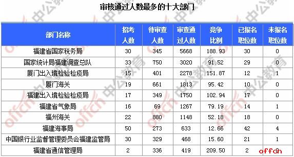 截止到5日16时,通过审核人数前三位的部门依次是:福建省国家税务局、国家统计局福建调查总队、厦门海关,三部门通过审核总人数达6667人,占通过审核总人数的61.611%。