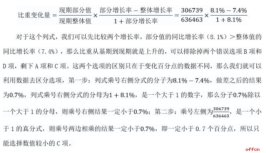 【解析】例1中,已知:现期值部分值,2014年第三产业增加值306739亿元,部分值的同比增长率,增长8.1%,还知道,现期整体值,2014年全国国内生产总值636463亿元,以及整体值的同比增长率,增长7.4%。求解:部分值占整体值的比重从基期到现期是如何变化的,以及变化了多少。其实就是考察了比重的变化量,利用我们之前讲过的比重变化量公式,我们可以很快列出算式: