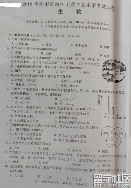 2016年湖南省衡阳市中考生物试题及答案