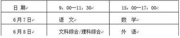2015年我省高考各科目考试时间:6月7日上午9:00-11:30语文;下午3:00-5:00数学;6月8日上午9:00-11:30文综/理综;下午3:00-5:00外语。